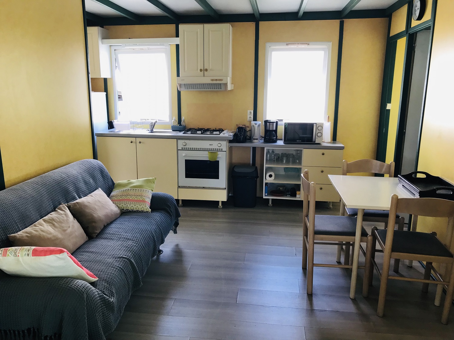 Cuisine équipée avec plaque cuisson au gaz hotte aspirante, four au gaz, réfrigérateur congélateur, vaisselle et ustensiles prévus pour 4 personnes dont cafetière, grille-pains, micro-ondes. Séjour avec canapé, table, et 4 chaises, téléviseur 36 cm (chaînes TNT), accès Wifi.